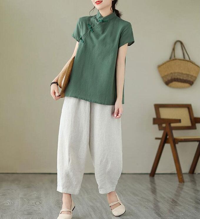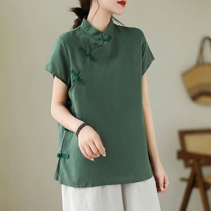 ブラウス リネンブラウス チャイナ風 レディース 半袖 立ち襟 斜めボタン 立ち襟 斜めボタン チャイナトップス プルオーバー チャイナボタン 無地 ゆったり 薄手 ナチュラル 春 夏 大人 かわいい おしゃれ エレガント カジュアル 送料無料