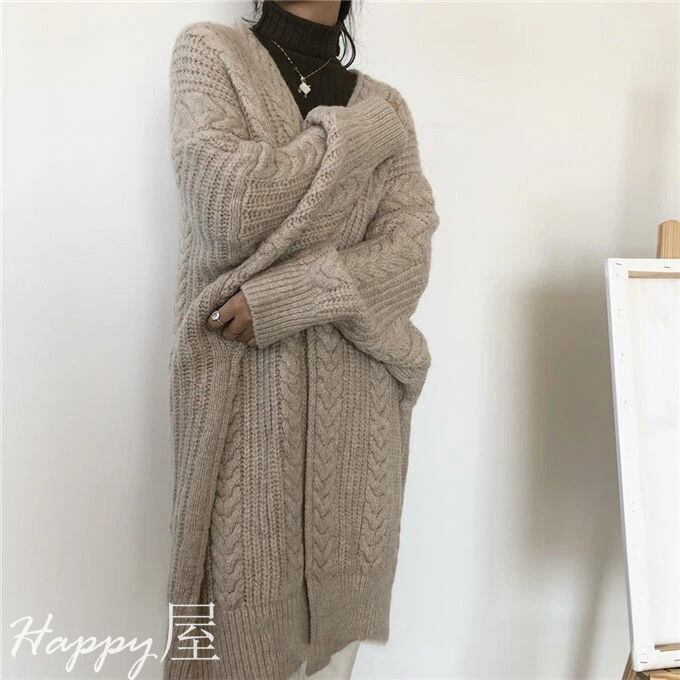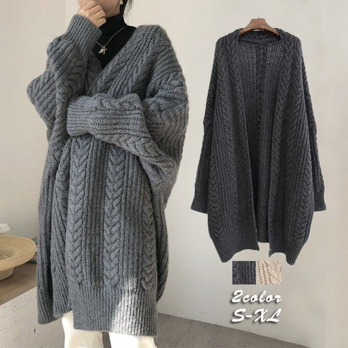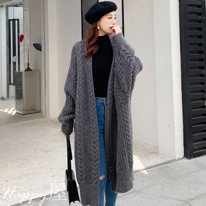 ニットカーディガン レデイース アウター 長袖 ロング丈 無地 ロングカーディガン 前開き 羽織り ケーブル編み レトロ 厚手 シンプル ゆったり 通勤 暖かい 秋新作 冬物 送料無料