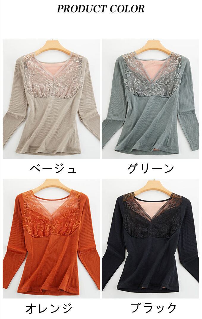 カットソー tシャツ長袖 レディース 厚手 裏起毛 Vネック トップス ボアTシャツ あったかインナー ストレッチ レース切り替え 防寒 暖かい 保温性 セクシー 秋冬 送料無料