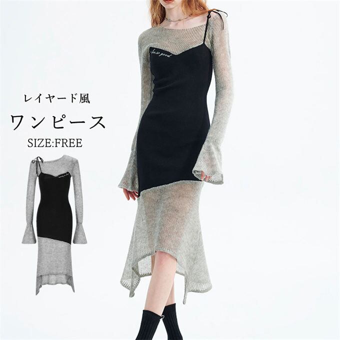 ワンピース レディース ニットセーター 長袖 バイカラー切り替え 透かし彫り ロングワンピース ミモレ丈 不規則 レイヤード風 重ね着風 大人 通学 通勤 カジュアル オフィス 春 夏 秋 送料無料