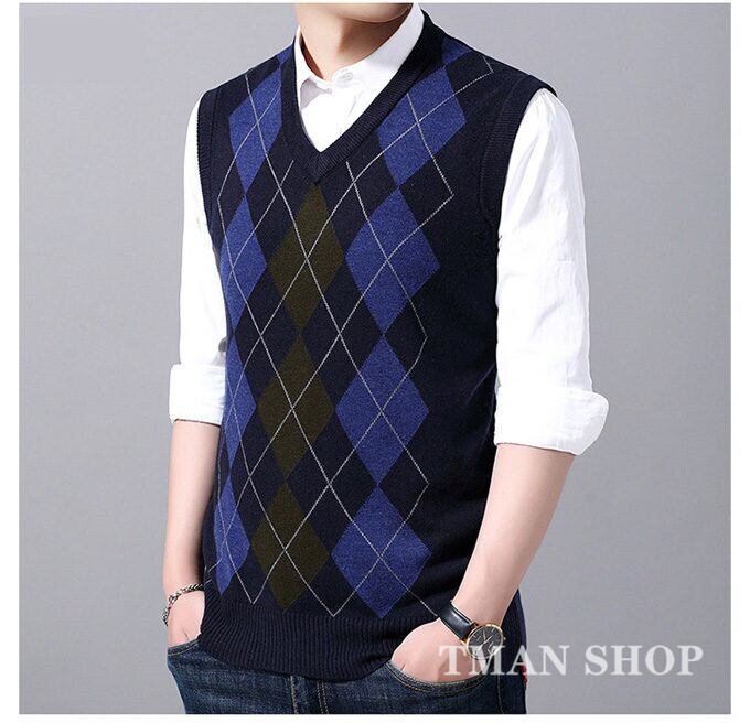 ニットベスト メンズ ウール混 ベスト 防寒 Vネック プルオーバー アウター ニット コート 菱形柄 ゆったり カジュアル 柔らか 秋冬 ファッション 新作 送料無料
