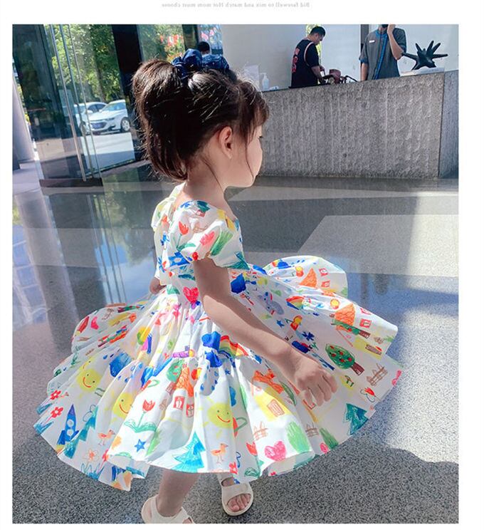 子供服 ワンピース 女の子 キッズ 子供ドレス 総柄 半袖 パフスリーブ ボリューム袖 プリント スクエアネック リボン ギフト 夏 かわいい おしゃれ 新作 送料無料