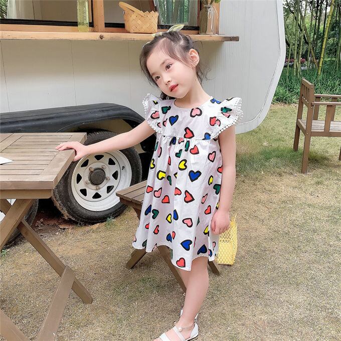 子供服 ワンピース 女の子 キッズ 子供ドレス 総柄 ノースリーブ フリル袖 ハート柄 クルーネック 切り替え ギフト 夏 かわいい おしゃれ 新作 送料無料