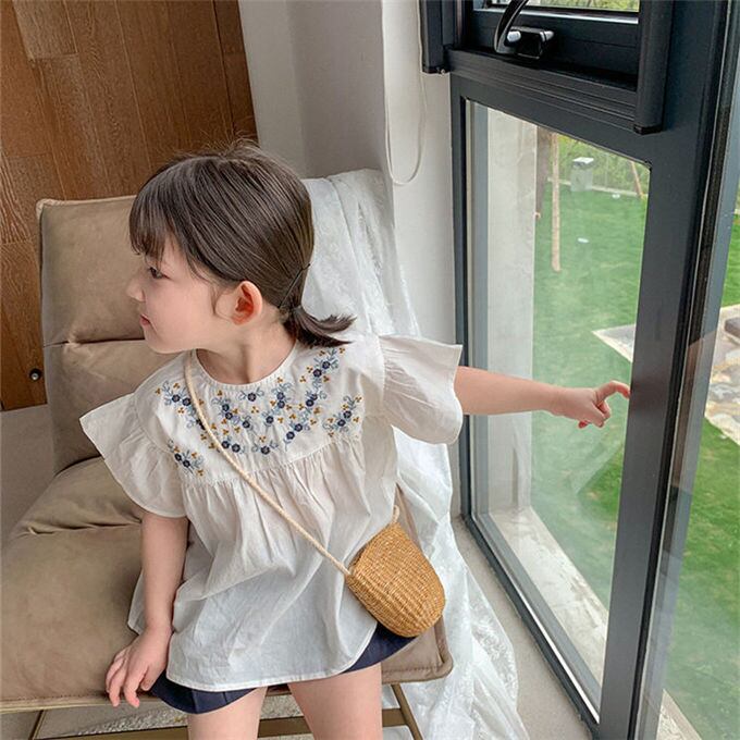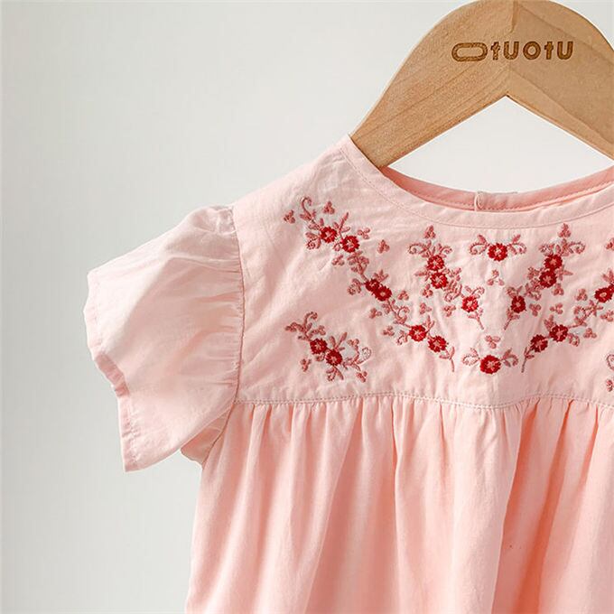 子供服 ワンピース 女の子 キッズ 子供ドレス 無地 半袖 ショート丈 フリル袖 刺繍 クルーネック コットン 切り替え シンプル ギフト 夏 かわいい おしゃれ 新作 送料無料