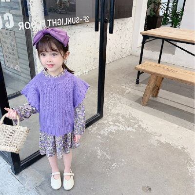 子供服 セットアップ 女の子 キッズ 2点セット 長袖 花柄ワンピース ニットベスト ケーブル編み 子供ドレス dress カジュアル ゆったり 春秋 通学着 可愛い 秋新作 送料無料