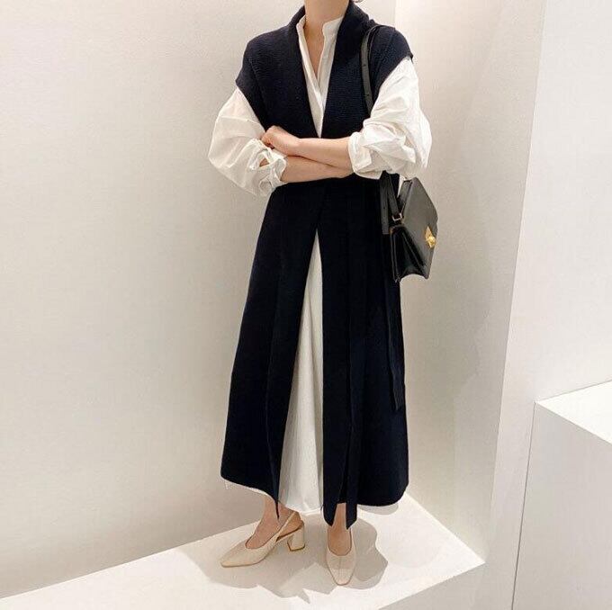 ニットベスト 袖なし ニットカーディガン シャツワンピース 長袖 レディース ロング丈 ベスト付き ゆったり ゆったり 大きいサイズ オシャレ 秋服 新作 送料無料