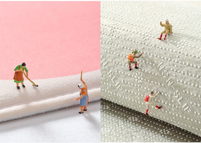 中材直立わた、通気性が優れ、ふかふかの踏み心地と共に、抜群の速乾性を実現します。脱水後の乾きが非常に早いのでお手入れラクラク。
