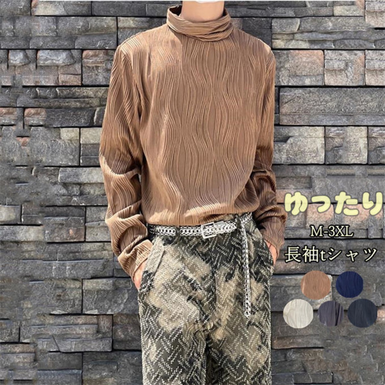 Tシャツ メンズ ハイネック 長袖 フリル トップス インナーtシャツ プリーツ ビッグTシャツ ビッグシルエット オーバーサイズ ゆったり 大きいサイズ ストリート系 ストリート カジュアル 韓国ファッション レトロ 秋服 冬服 送料無料
