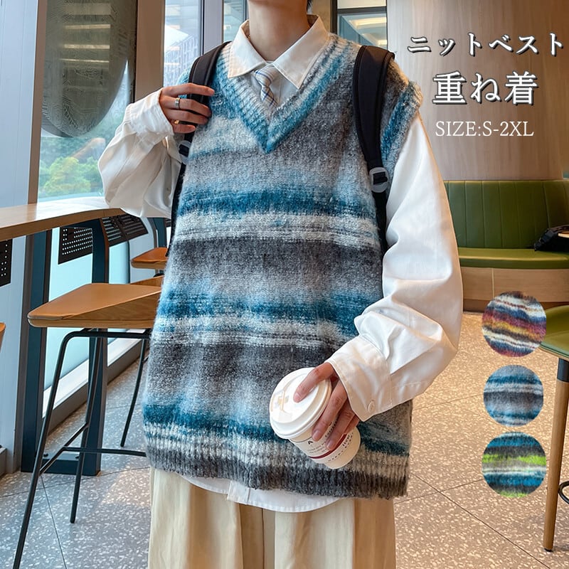 ニットベスト メンズ レディース 重ね着 ニット トップス ボーダー柄 Vネック ペアルック ゆったり ビッグシルエットオーバーサイズ 大きめ 大人気 おしゃれ カジュアル モード ストリート 韓国ファッション レトロ 秋 冬 送料無料
