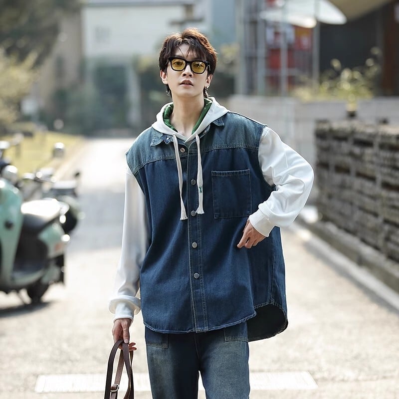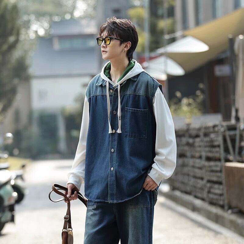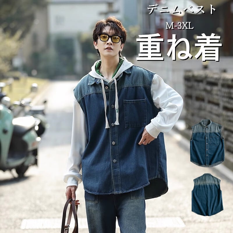 デニムベスト メンズ アウター トップス シングル オーバーサイズ ゆったり 大きいサイズ 羽織り 重ね着 薄手 カジュアル 韓国 ファッション おしゃれ きれいめ レトロ 秋 冬 送料無料