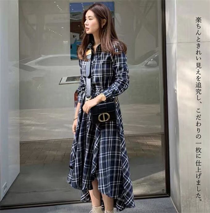 シャツワンピース チェック レディース 長袖 カジュアル ミモレ丈 おしゃれ 可愛い フェミニン レトロ ボタン ウエストベルト ゆったり 体型カバー きれいめ 秋 冬 20代 30代 40代 50代 送料無料