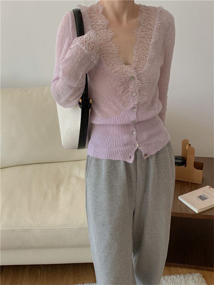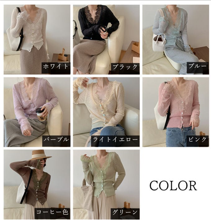 レースカーディガン レディース ニットショート丈 Vネック 長袖 トップス 薄手 シングル タイト 細見え フェミニン おしゃれ 大人可愛い きれいめ シンプル 韓国 ファッション 秋冬 送料無料