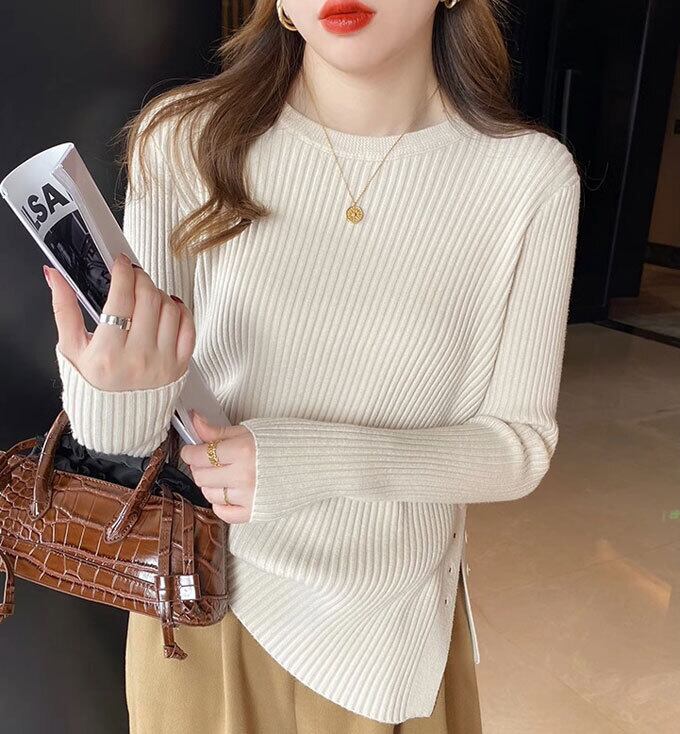 ニット トップス レディース サイドスリット ボダン付き ニットセーター 長袖 リブ グルーネック リブニット 秋冬 無地 キレイめ シンプル 秋冬 新作 送料無料