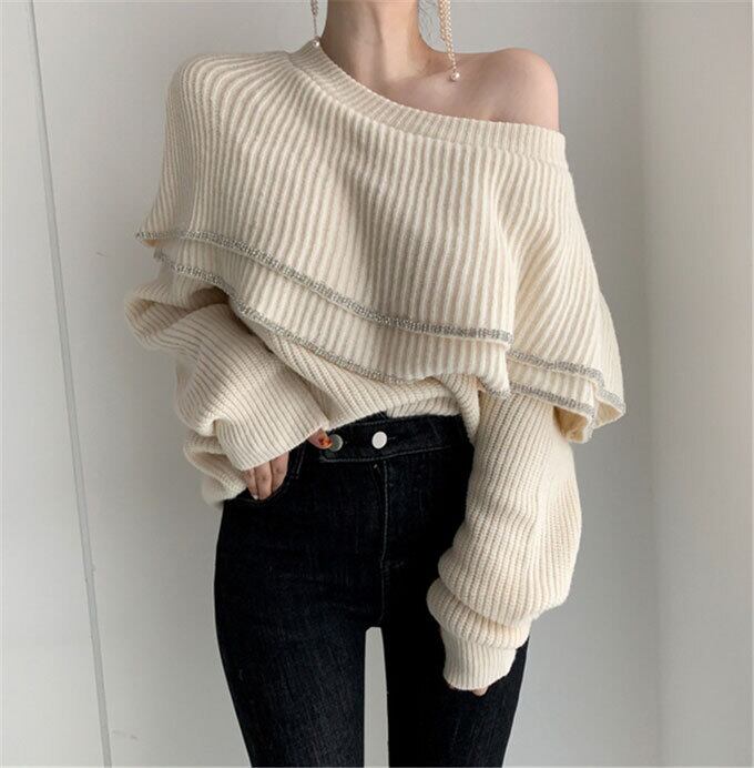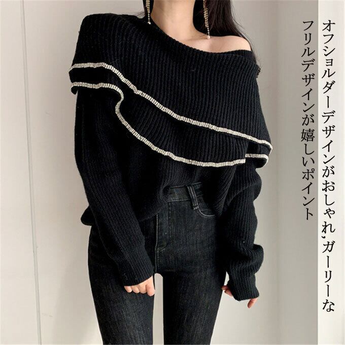 ニットトップス フリル ニット レディース 長袖 ニットソー 無地 ニットセーター 韓国風 2way オフショルダー プルオーバーセクシーセーター ニットトップス 秋冬 体型カバー着やせ 秋服 送料無料