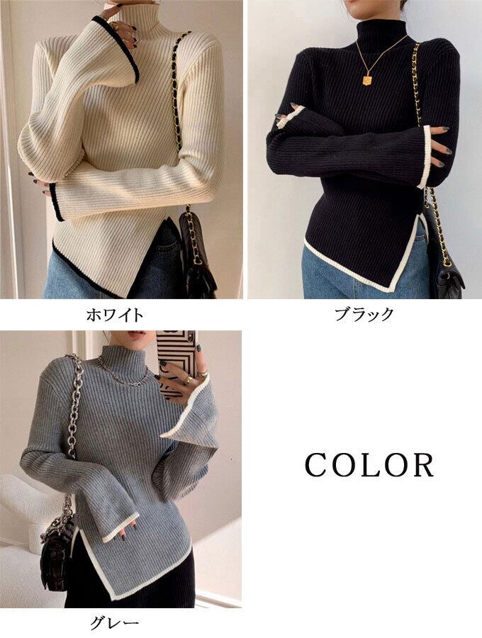 ニットトップス レディース タートルネック リブ ニット フレアスリーブ バイカラー スリット キレイめ 細見え おすすめ おしゃれ フリーサイズ 秋冬 新作 送料無料