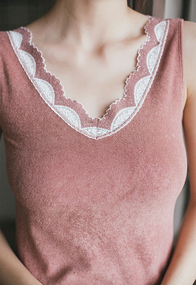 ・前後Vネックラインのシルエットで顔まわり、デコルテを美しく見せてくれる、繊細なレース使いのキャミソール。