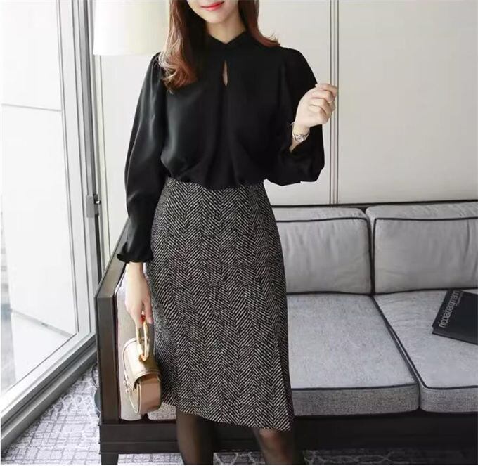クラシックな雰囲気のブークレ見えするチェック柄タイトスカート。