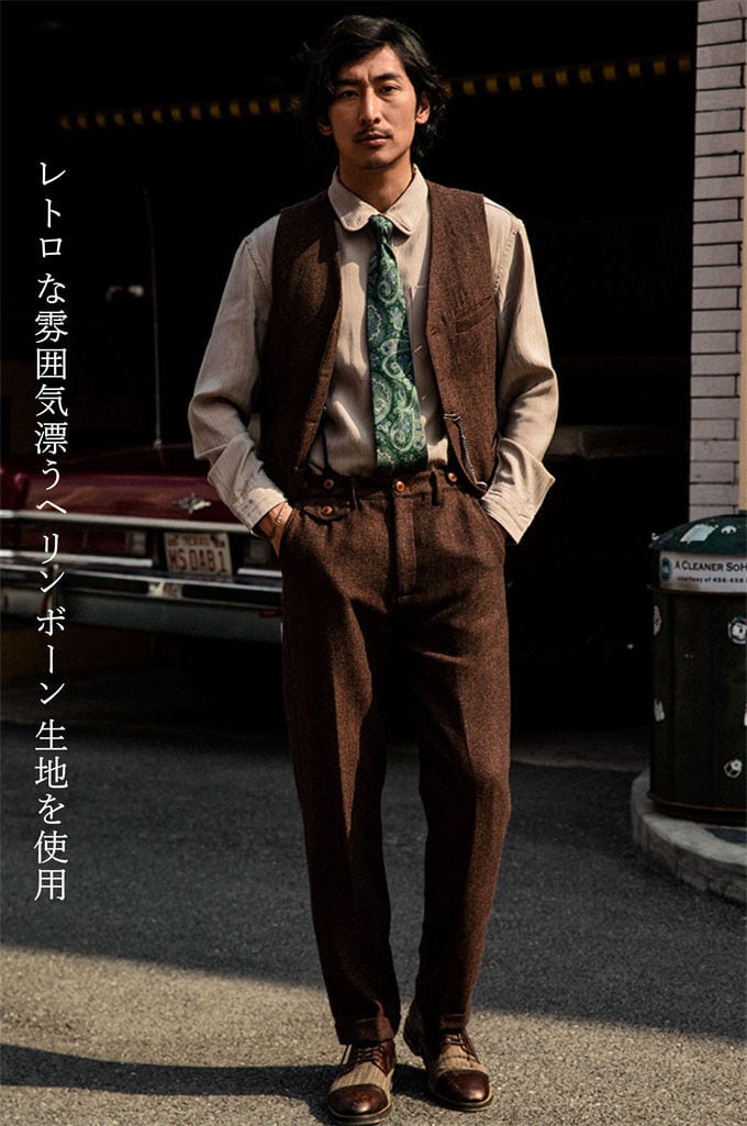 ●レトロな雰囲気漂うヘリンボーン生地を使用。ジャケットやアウターのインナーはもちろん、これ一枚でレトロなテイストの雰囲気を感じさせます。