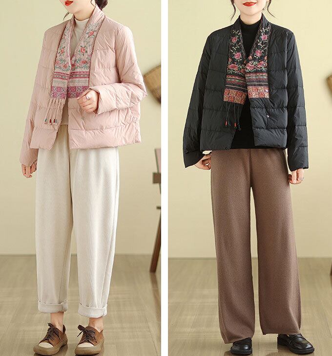 中綿コート ショート コート レディース 刺繍 Vネック 中綿ジャケット 女性用 アウター 厚手 暖かい あったか 防寒 通勤 カジュアル 大きいサイズ 民族風 チャイナ風 きれいめ おしゃれ 20代 30代 40代 50代 花柄 M L XL 2XL 秋冬 送料無料