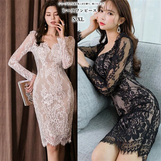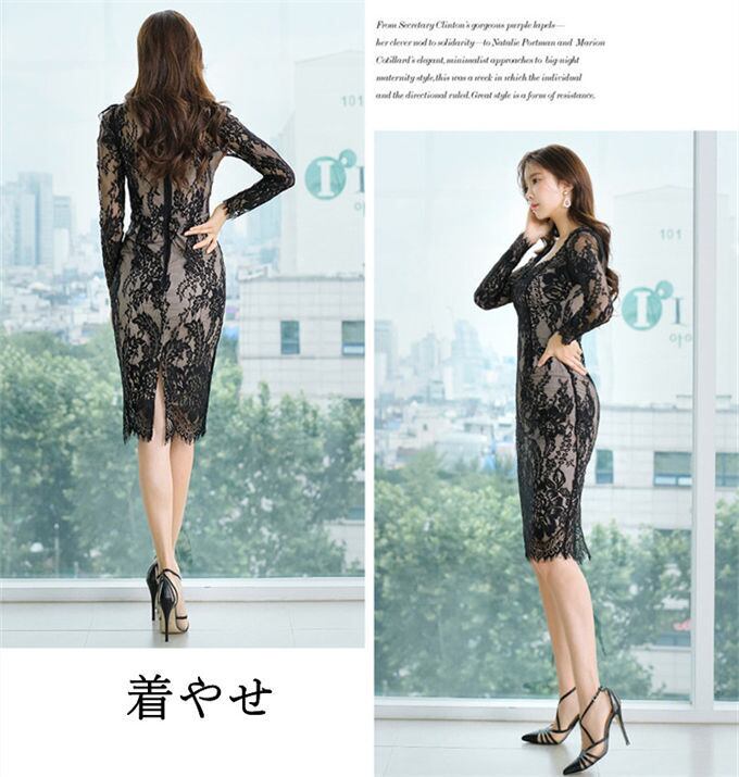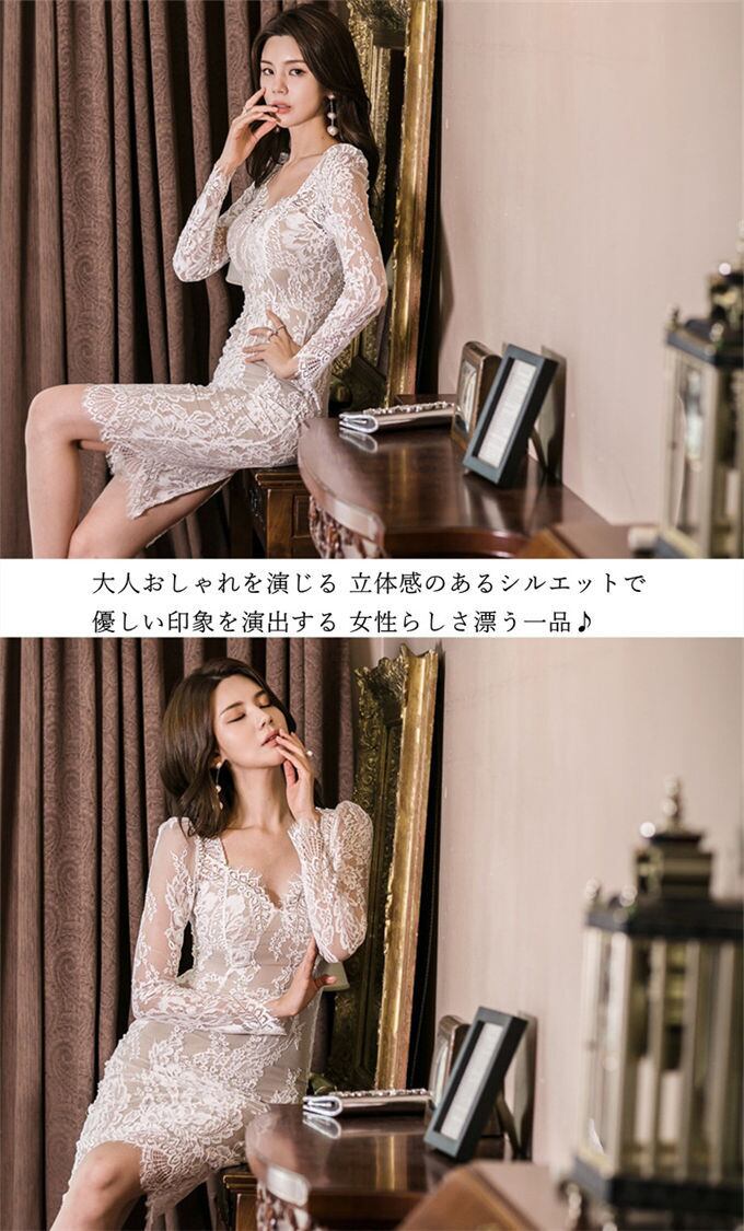 レースワンピース タイトワンピース レース刺繍 姫系ワンピース ひざ丈 ミドル丈 ミディアム丈 Vネック パーティドレス 長袖 セクシー OL 上品 オフィス 二次会 結婚式 韓国ファッション 春 秋 冬 送料無料