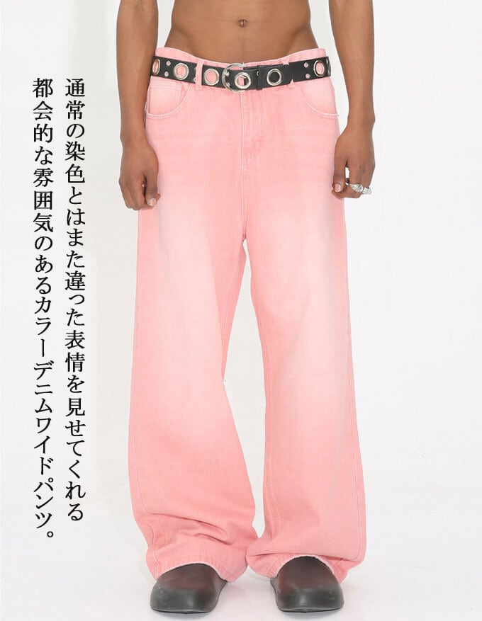 通常の染色とはまた違った表情を見せてくれる都会的な雰囲気のあるカラーデニムワイドパンツ。