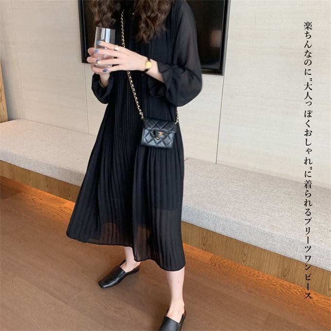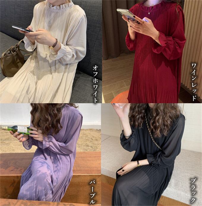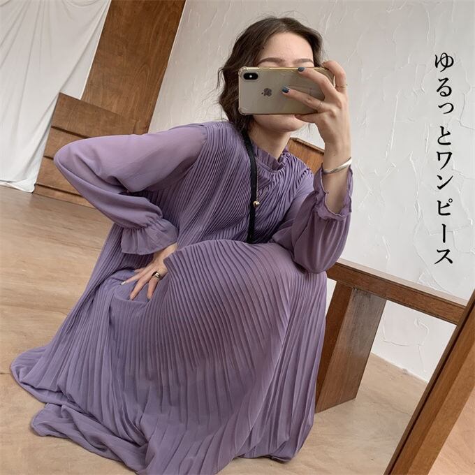 プリーツワンピース ワンピース レディース プリーツ フリル ロング 春 ゆったり Aライン 長袖 上品 フレア スタイルアップ お出かけ デート 20代 30代 40代 オケージョン 着やせ 大人 リラックス
