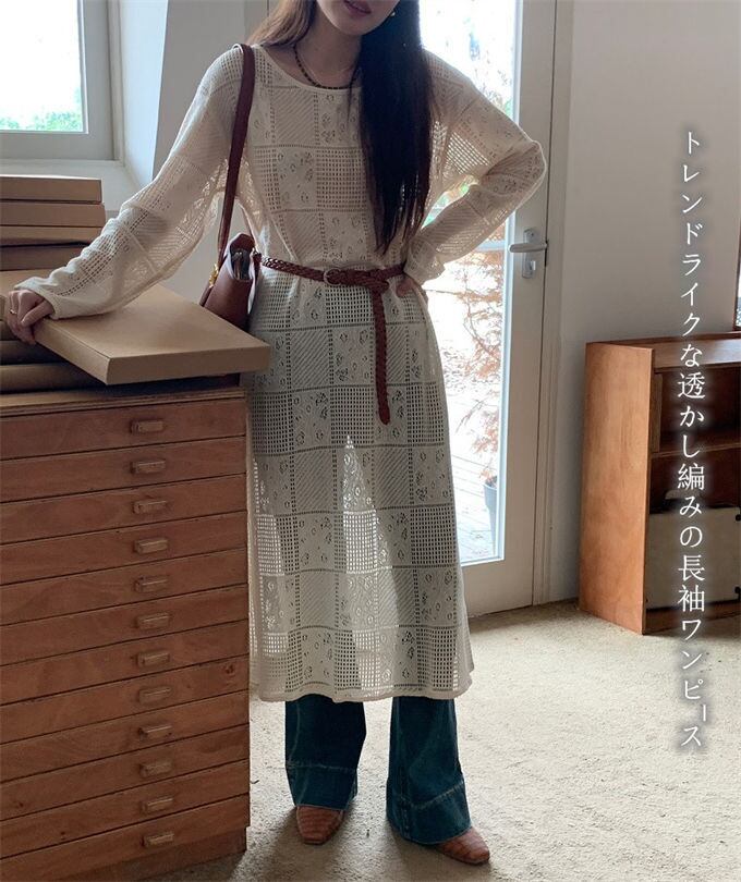 トレンドライクな透かし編みの長袖ワンピ―ス。