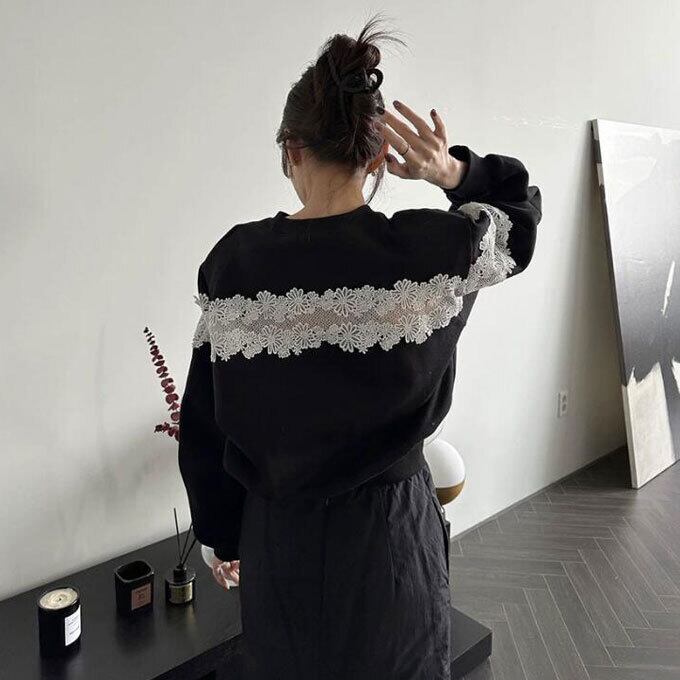 トレーナー レディース 長袖 スウェット ショート丈 花柄レース レース 切替 キレイめ ラウンドネック ゆったり 体型カバー 無地 シンプル カジュアル ビックサイズ パーカー 韓国ファッション 春秋 新作 送料無料 大人カジュアルを盛り上げるレーススウェット♪トレーナー カジュアル トップス