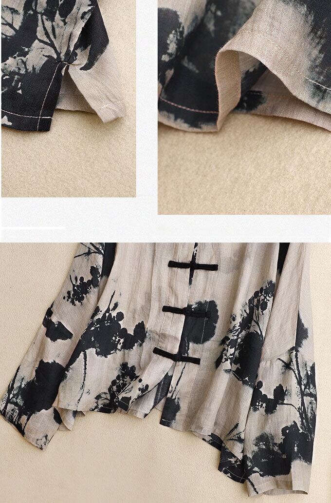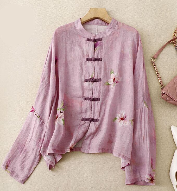 ブラウス レディース 綿麻風 長袖 トップスプリント プルオーバー チャイナ風 20代 30代 40代 50代 長袖ブラウス ゆったり 薄手 春秋 花柄ブラウス お洒落 レトロ 体型カバー カジュアル 送料無料 優雅な気分を作り出すチャイナー風ブラウス カジュアル 綿麻風 トップス