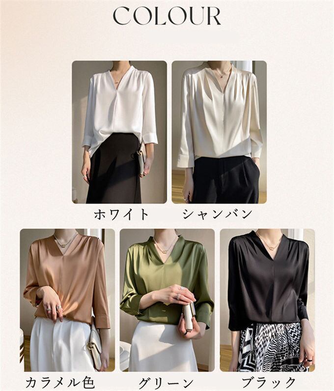 シャツブラウス レディース Vネック プルオーバー おしゃれ オフィス ビジネス シルク風 サテン風 光沢感 キレイめ 九分袖 ゆったり トップス シンプル 通勤 エレガント フォーマル 春 夏 秋 送料無料