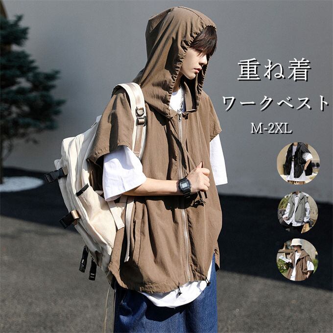 ワークベスト メンズ 袖なしジャケット トップス 男女兼用 フード付き 重ね着 アウトドアベスト 薄手 ゆったり ビッグシルエット 韓国ファッション 個性 大きいサイズ 春 夏 秋 送料無料
