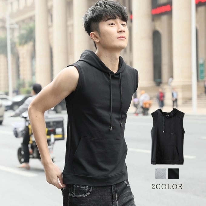タンクトップ メンズ ノースリーブ ベスト 無地 細身 フード付き 運動 スポーツ 綿 カジュアル 通学 トップス 夏物 新作 送料無料