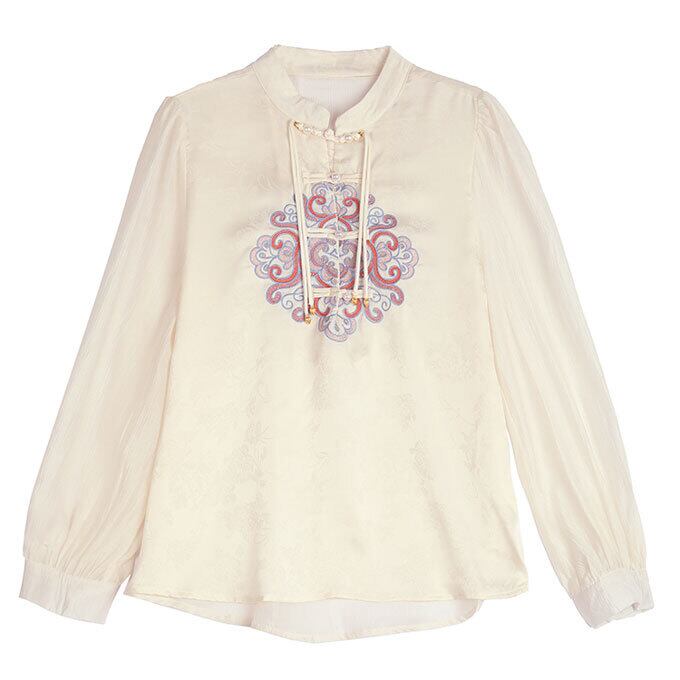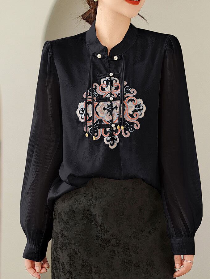 繊細な花柄刺繍とチャイナボタンをあしらった中国風ブラウス。