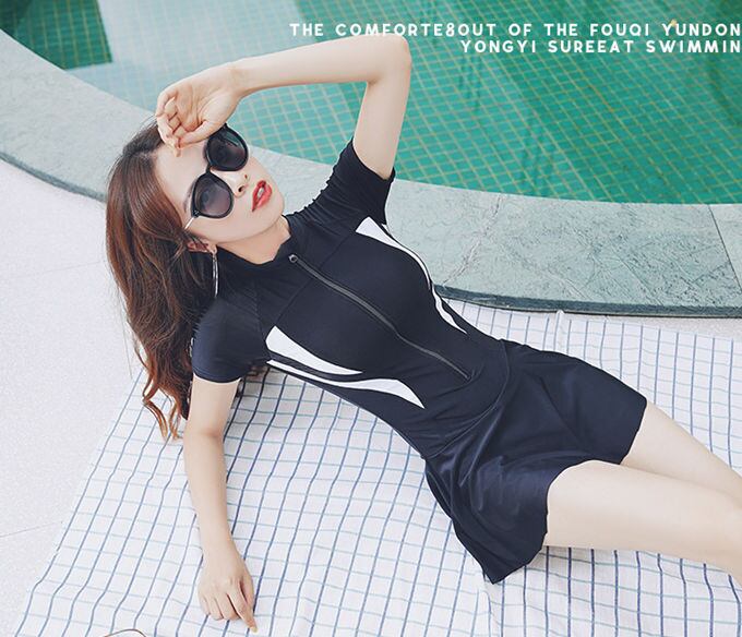 ●[水陸両用でもオススメ]一体型ショートパンツ、めくれても安心!スカートの下のショーツはワンピースと一体型で、アクティブに動きやすい。ハイネックで胸元をカバー、ちらっと見ることができません。
