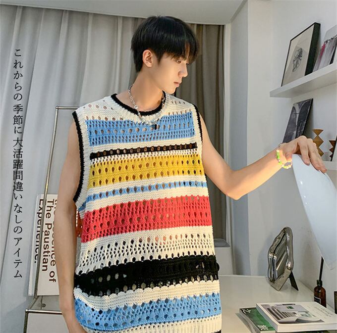 サマーニット ベスト メンズ 薄手 夏 サマーベスト 透かし編みベスト クルーネック ボーダー柄 透ける 涼しい おしゃれ ゆったり ビックシルエット ヒップホップ レイヤード 重ね着 トップス 韓国ファッション 春服 夏服 送料無料