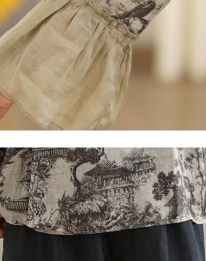 綿麻風 トップスブラウス レディース 長袖 トップスプリント プルオーバー チャイナ風 長袖ブラウス フレア袖 ゆったり 薄手 春秋 ブラウス お洒落 レトロ 体型カバー カジュアル 20代 30代 40代 50代 送料無料