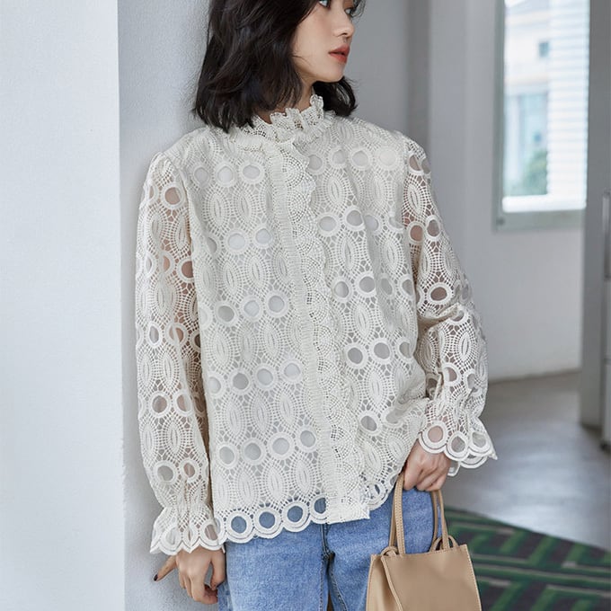 シャツブラウス スタンドカラー レースブラウス レディース レーススリーブ 長袖ブラウス 透け感 総レース トップス キレイめ オシャレ かわいい 卒園式 入園式 入学式 卒業 結婚式 通勤 オフィス OL 春 夏 秋 送料無料