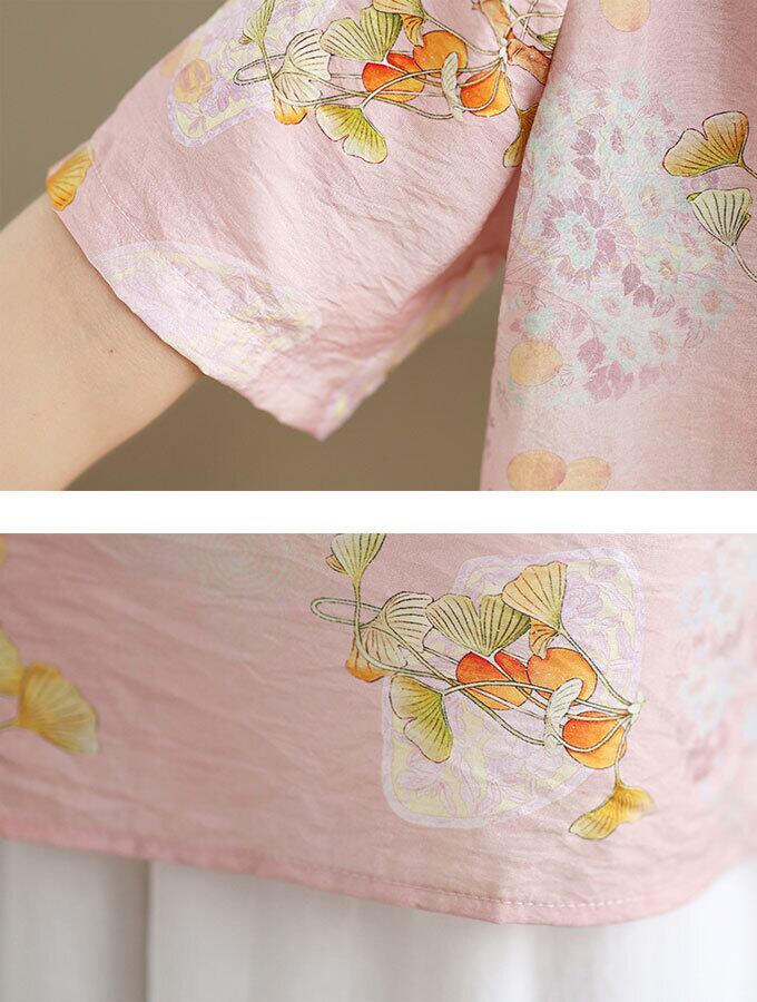 ブラウス レディース 綿麻風 半袖 トップス プリント プルオーバー チャイナ風 20代 30代 40代 50代 ブラウス ゆったり 薄手 春秋 花柄 プリント ブラウス お洒落 レトロ 体型カバー カジュアル 夏 春 送料無料
