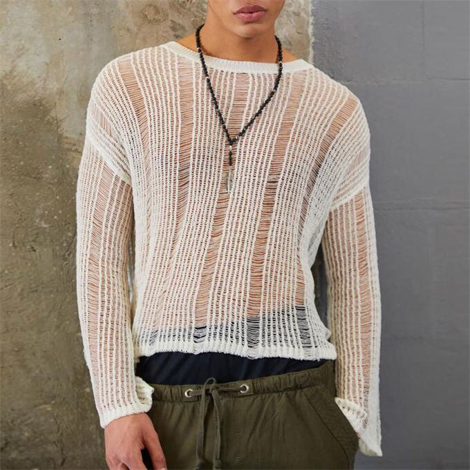 サマーニット メンズ 長袖 ニット セーター 薄手 夏 透かし編み クルーネック メッシュ 透ける ストレッチ おしゃれ ゆったり ビックシルエット ヒップホップ レイヤード 重ね着 トップス 韓国ファッション ストリート 春服 夏服 ブラック ホワイト 送料無料