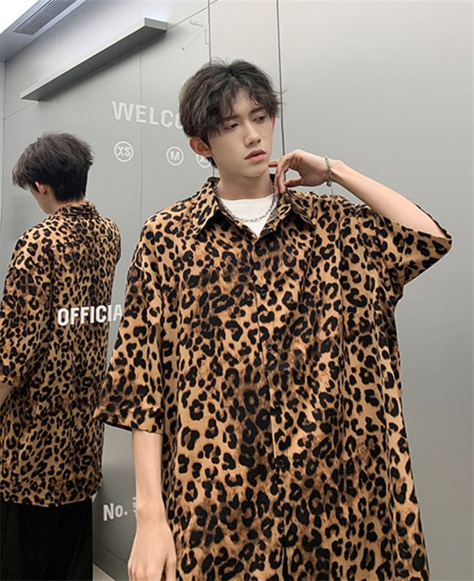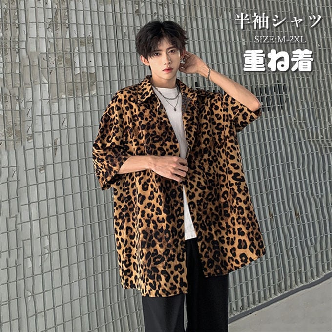 半袖シャツ メンズ 五分袖 ワークシャツ 開襟シャツ 羽織り 重ね着 ヒョウ柄 大きいサイズ トップス レイヤード風 ゆったり 大きいサイズ おしゃれ 着痩せ 韓国ファッション カジュアル 通学 通勤 夏物 送料無料