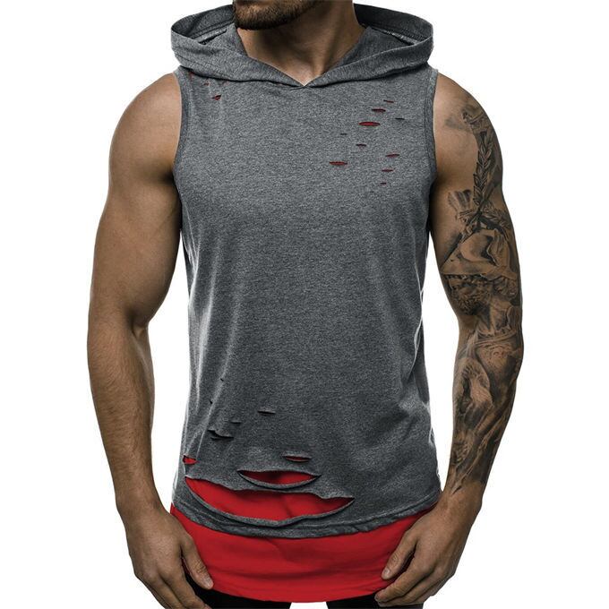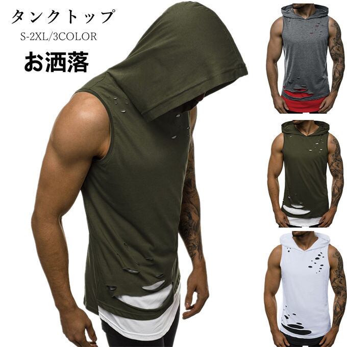 タンクトップ メンズ tシャツ ノースリーブ フード付き ダメージ加工 ヒップホップ プリント 大きいサイズ おしゃれ 運動 スポーツ トレーニング コーデ レイヤード カジュアル ストリート 韓国ファッション お洒落 通学 通勤 夏 送料無料
