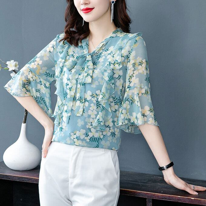 シフォンブラウス レディース 薄手花柄シフォン ふんわりフレアスリーブ 七分袖 7分袖 フリル袖 リボン付き エレガント おしゃれ きれいめ 涼しい 大人 トップス 春夏 夏 送料無料