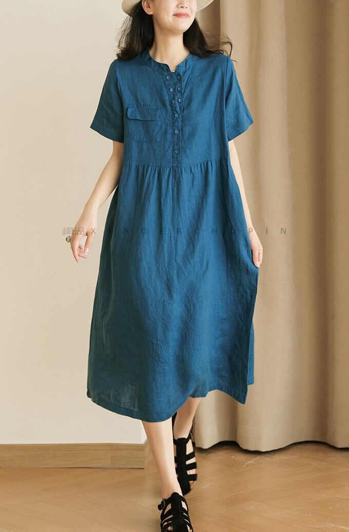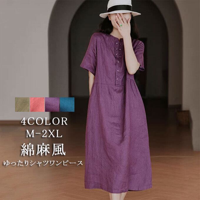 シャツワンピース リネンタッチワンピース シンプル レディース ミモレ丈 半袖ワンピース リゾートワンピ リラックス ゆったり 体型カバー ワンピース おしゃれ キレイめ 韓国ファッション 夏 新作 送料無料