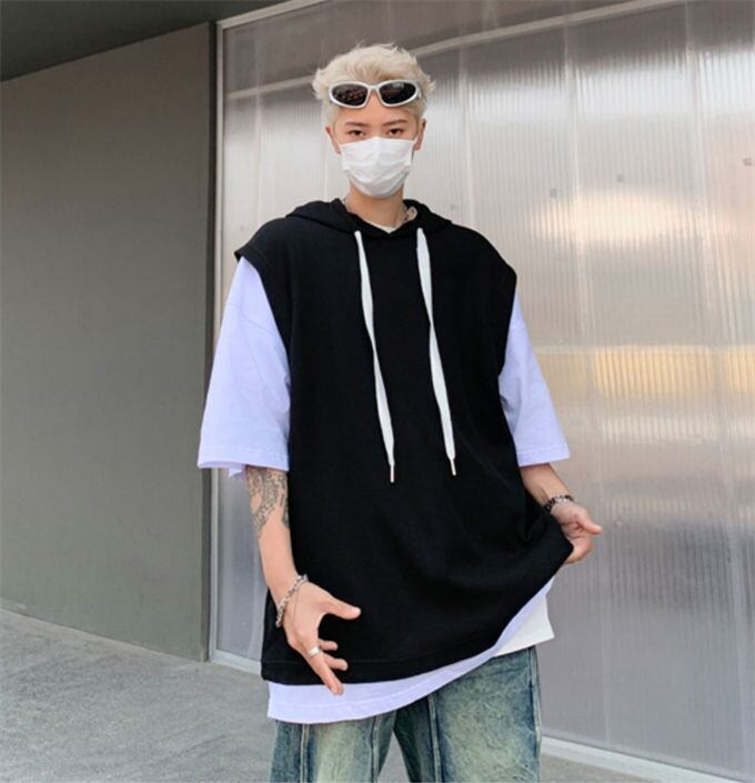 半袖tシャツ メンズ 五分袖 バイカラー切り替え ゆったり ビックシルエット ヒップホップ レイヤード 重ね着 フード付き トップス スポーツ シンプル おしゃれ かっこいい オフィス カジュアル 男性用 ストリート系 春夏 夏服 送料無料