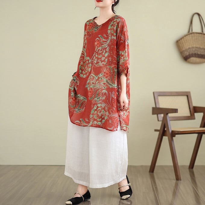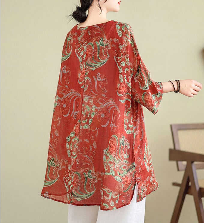 シャツブラウス レディースロング丈 綿麻風 花柄 プリント7分袖 Vネック トップススリット プルオーバー チャイナ風 20代 30代 40代 50代 ブラウス ゆったり 薄手 春秋 花柄ブラウス お洒落 体型カバー カジュアル 送料無料