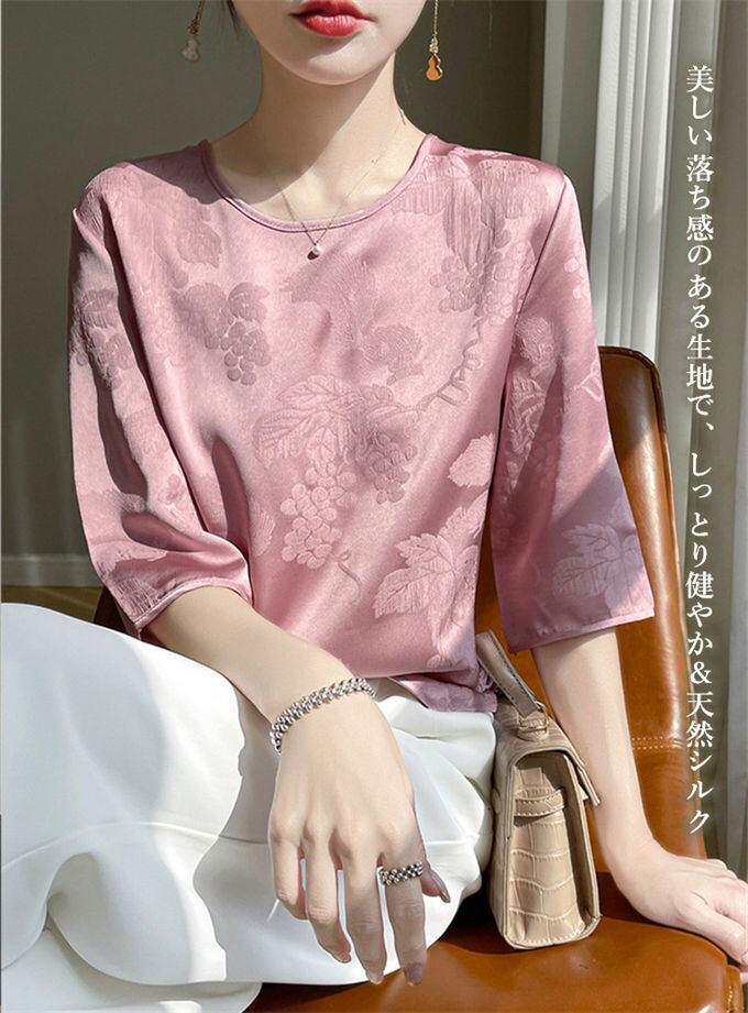 ブラウス シルク 半袖 レディース シャツ tシャツ トップス サテン 五分袖 プルオーバー Uネック シャツブラウス 体型カバー インナー 大きいサイズ 薄手 滑らか ひんやり 吸湿 高品質 敏感肌 光沢感 透けない 大人 きれいめ 上品 エレガント ゆったり 夏 送料無料 軽やかでシワになりにくいシルクブラウスです。清楚な華やぎ感がありながらもシンプルにまとめた好感度の高い!どんなボトムスとも相性バッチリで女性らしい柔らかな雰囲気を演出♪
