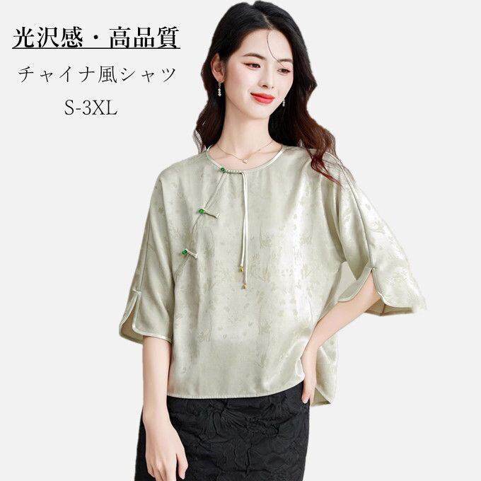ブラウス レディース トップス 半袖 半そで 五分袖 前開き チャイナ風 チャイナボタン 中華風 シャツブラウス Uネック プリント カジュアル 柔らか セレモニー シンプル きれいめ サテン 光沢感 滑らか 上品 高品質 着回し エレガント ゆったり 夏 送料無料