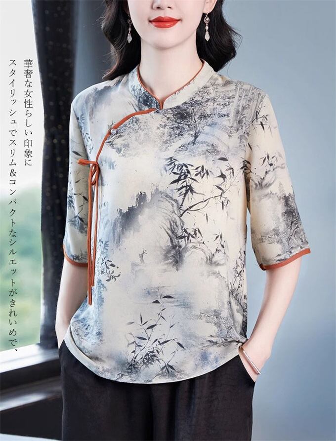 ブラウス レディース トップス 半袖 五分袖 七分袖 前開き チャイナ風 中華風 シャツブラウス Uネック プリント カジュアル 柔らか セレモニー シンプル きれいめ 上品 高品質 ゆったり 体型カバー ママ 夏 送料無料