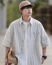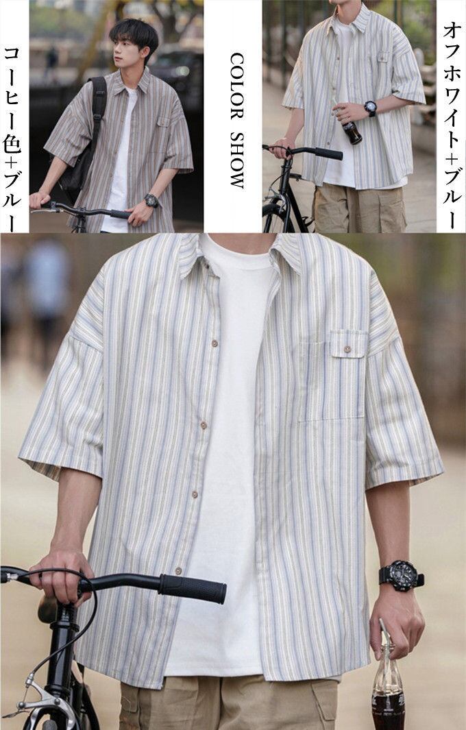 シャツ 5分袖 五分袖 かっこいいシャツ カジュアルシャツ シャツ 夏 襟付きシャツ ワークシャツ メンズ ストライプ 羽織 ポケット おしゃれ カジュアル レイヤード風 ビッグシルエット 大きいサイズ 夏 送料無料