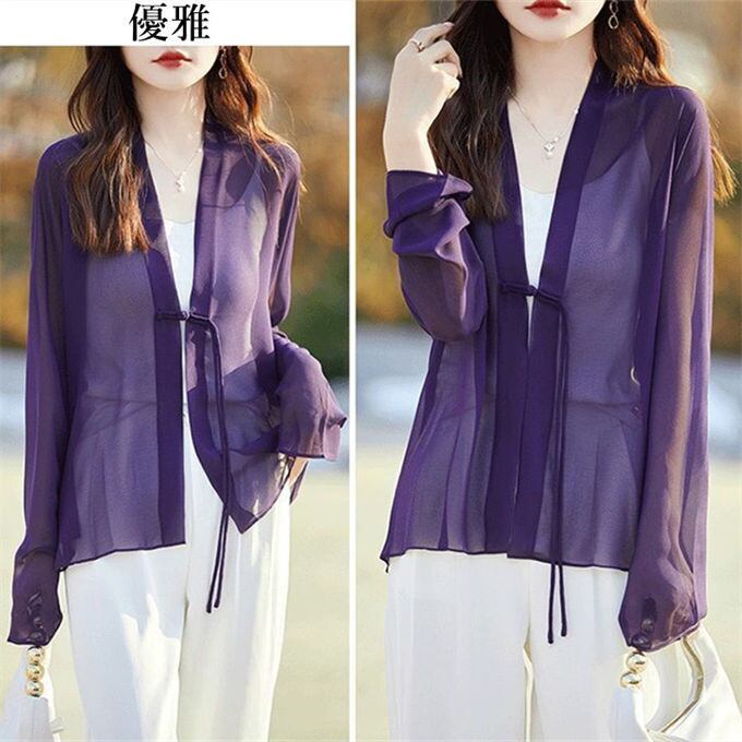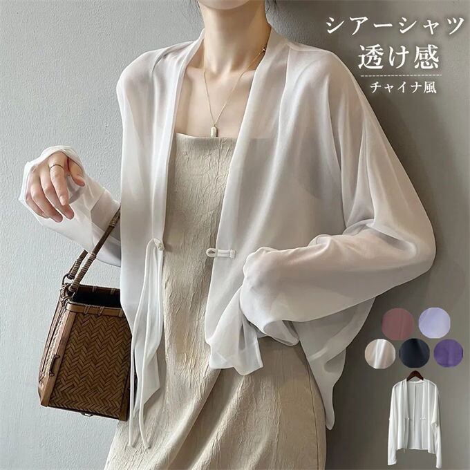 シアーシャツ サマーシャツ シフォンブラウス チャイナ風 長袖 シンプル 無地 UVカット おしゃれ 体型カバー シャツブラウス レディース サマーカーデ 薄手 涼しい 透け感 おしゃれ 着やせ 冷房対策 紫外線対策 ゆったり カジュアル 優雅 通勤 韓国ファッション 春 夏 秋 送料無料